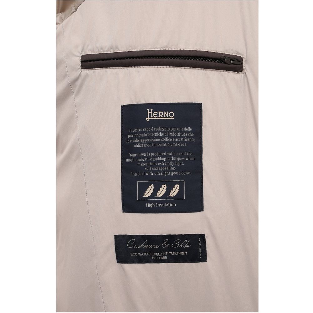Elevate your wardrobe with the impeccable fusion of luxury and function present in the Herno cashmere and silk down jacket. Expertly crafted in Italy, this piece combines sumptuous materials with practical down filling, ensuring warmth and style. The zipper and button closure add a touch of classic elegance, while the polyester lining provides extra comfort. Adorned with a knitted embroidered inner collar, this jacket is a statement of refined sophistication.